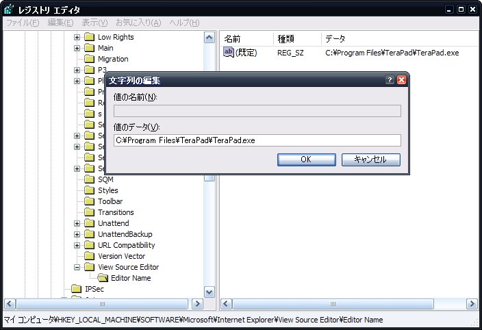もともと存在しているIntenet Explorerキーの下に、View Source Editorキーがあり、さらにその下にEditor Nameというキーが作られていることに注意。