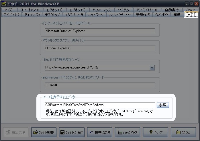 「窓の手」は、[ソースの表示]のエディタ変更以外にも、色々とカスタマイズできるので、入手して損はないソフトだ。ちなみに、各タブを選択した後、[ヘルプ]をクリックすると、別窓が開いて、選択タブの使い方、語句の説明などが表示される。設定を変えるときは、すぐに設定前に戻せるように、[バックアップ]ボタンを押してから設定すると、失敗が無く安心だ。