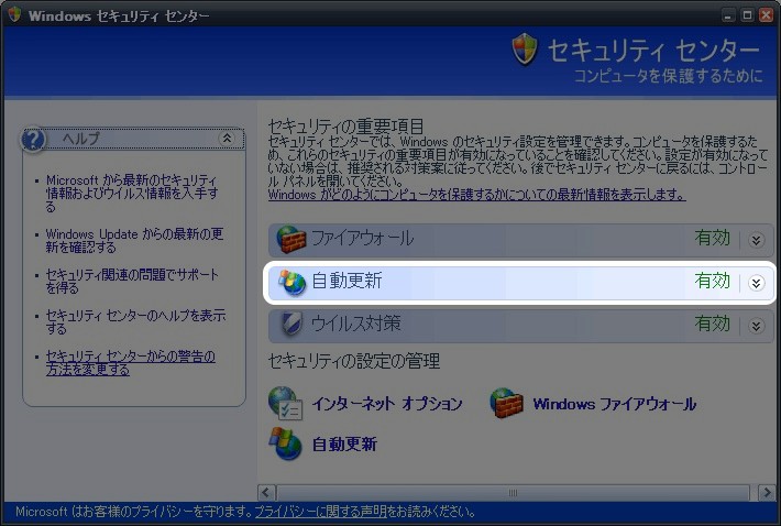 「セキュリティーセンター」で自動更新をオンにしておくと、サービスパック、重要度の高い更新プログラムを、自動的にインストールし、アップデートを行ってくれる。自動更新設定は、Windowsを常に最新の状態に保ち、不具合が出たときは、元に戻すために必要だが、ダウンロードしたファイルが溜まって、容量を圧迫して行く。