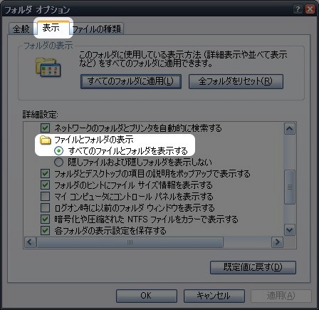 「表示」タブを開き、「ファイルとフォルダの表示」項目にある、「すべてのファイルとフォルダを表示する」にチェックを入れ、「OK」する。