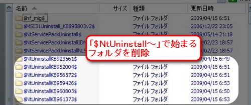 - このデータを削除すると、「コントロールパネル」の「プログラムの追加と削除」に、更新プログラムの項目名が残っていても、削除できなくなるので、空き容量に余裕があるのであれば、最近の更新プログラムは、念のため残しておいたほうがよい。フォルダの作成日時を確認して、古いものだけ削除しましょう。